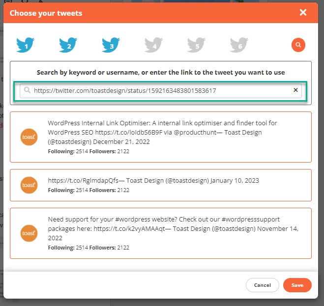 The twitter picker will try and suggest content but if you want something specific, simply copy and paste the URL to the tweet you would like to see along side your blog post.